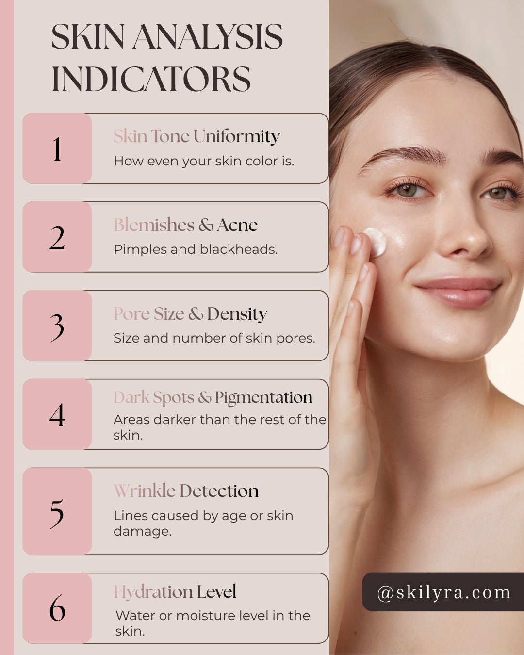 Examines your skin tone for uneven areas or pigmentation. SkiLyra then suggests brightening and tone-correcting solutions for a more radiant, balanced look.